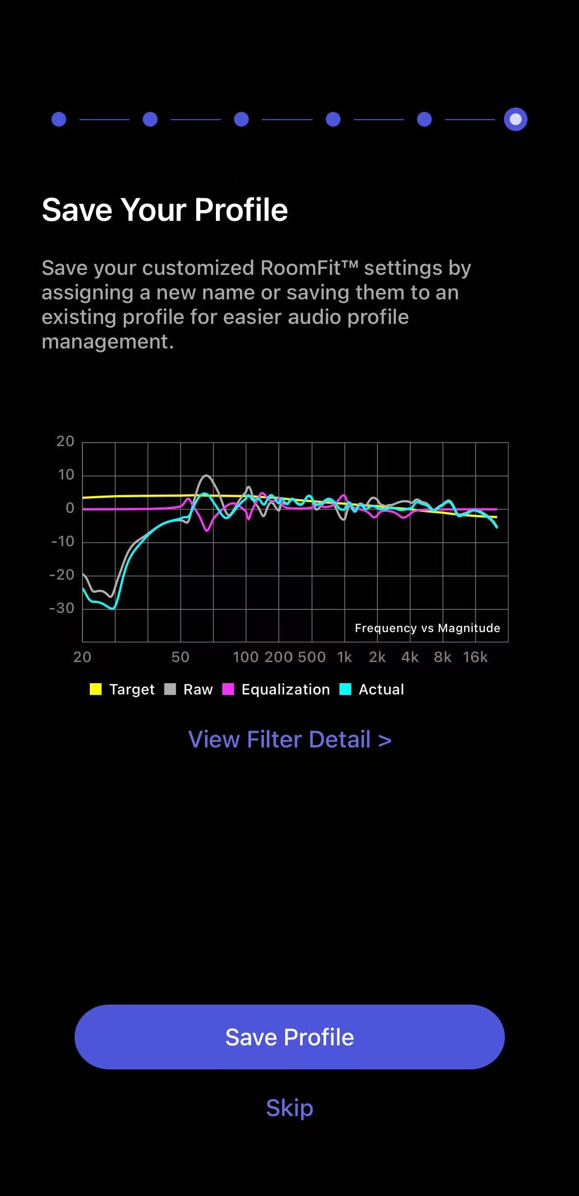 - Tap Save Profile to save the RoomFit™ results as a custom profile. Alternatively, tap Skip to save into the Auto profile.