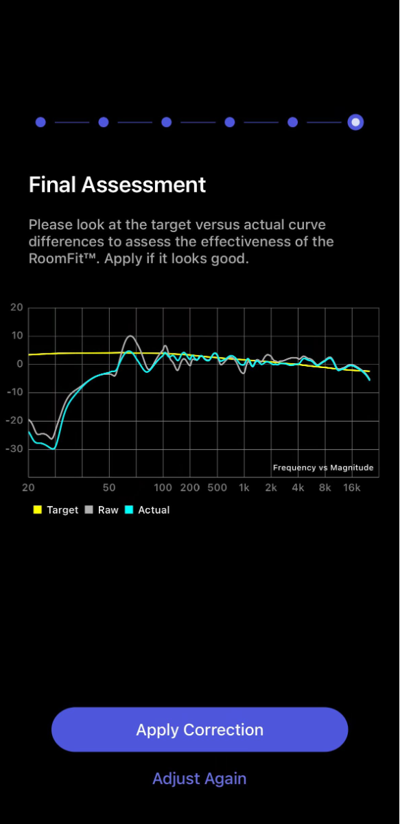 If the cyan curve closely matches the yellow curve within the adjustable range, the RoomFit™ result is effective and tap Apply Correction to proceed. If there are large differences, tap Adjust Again to re-run RoomFit™.